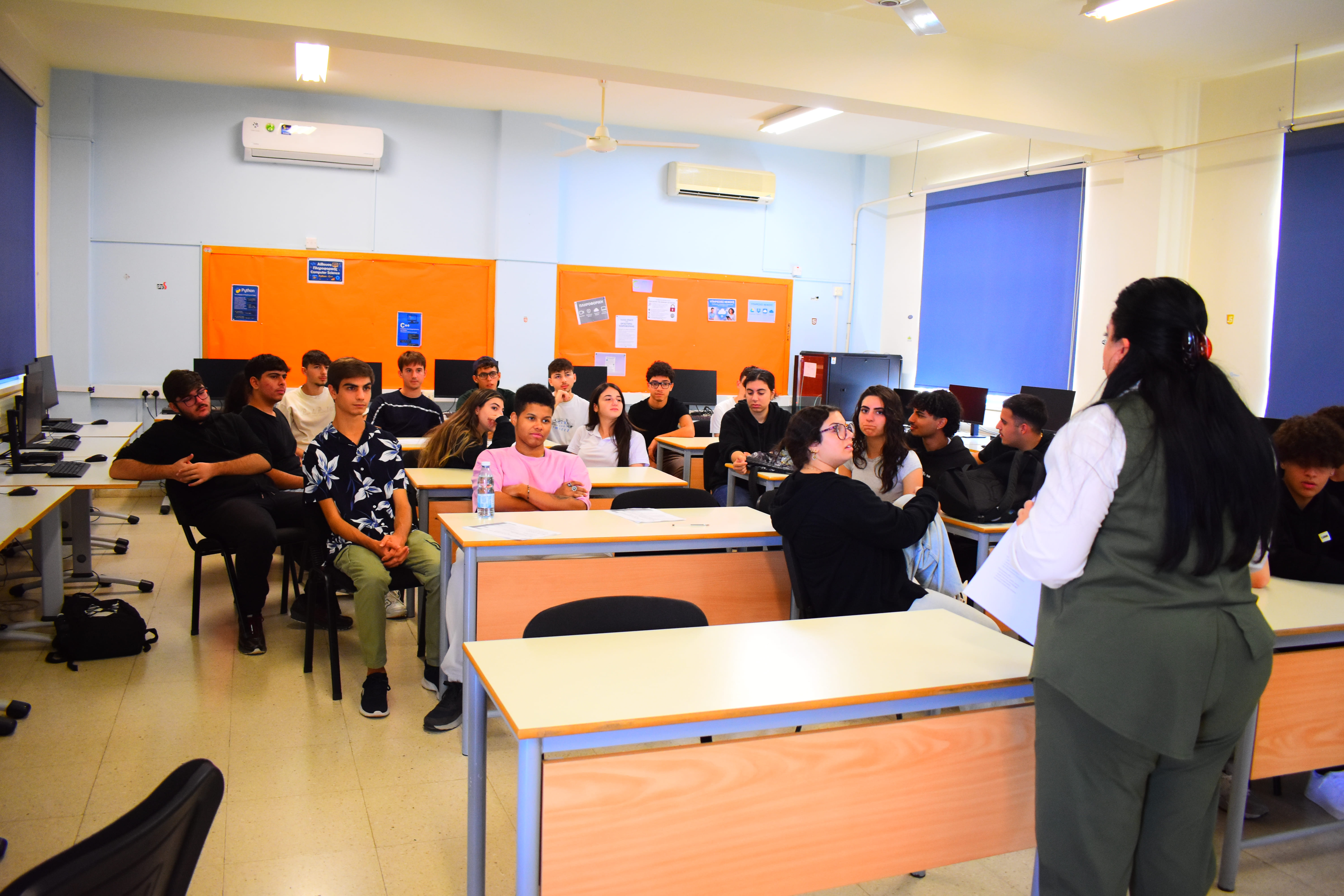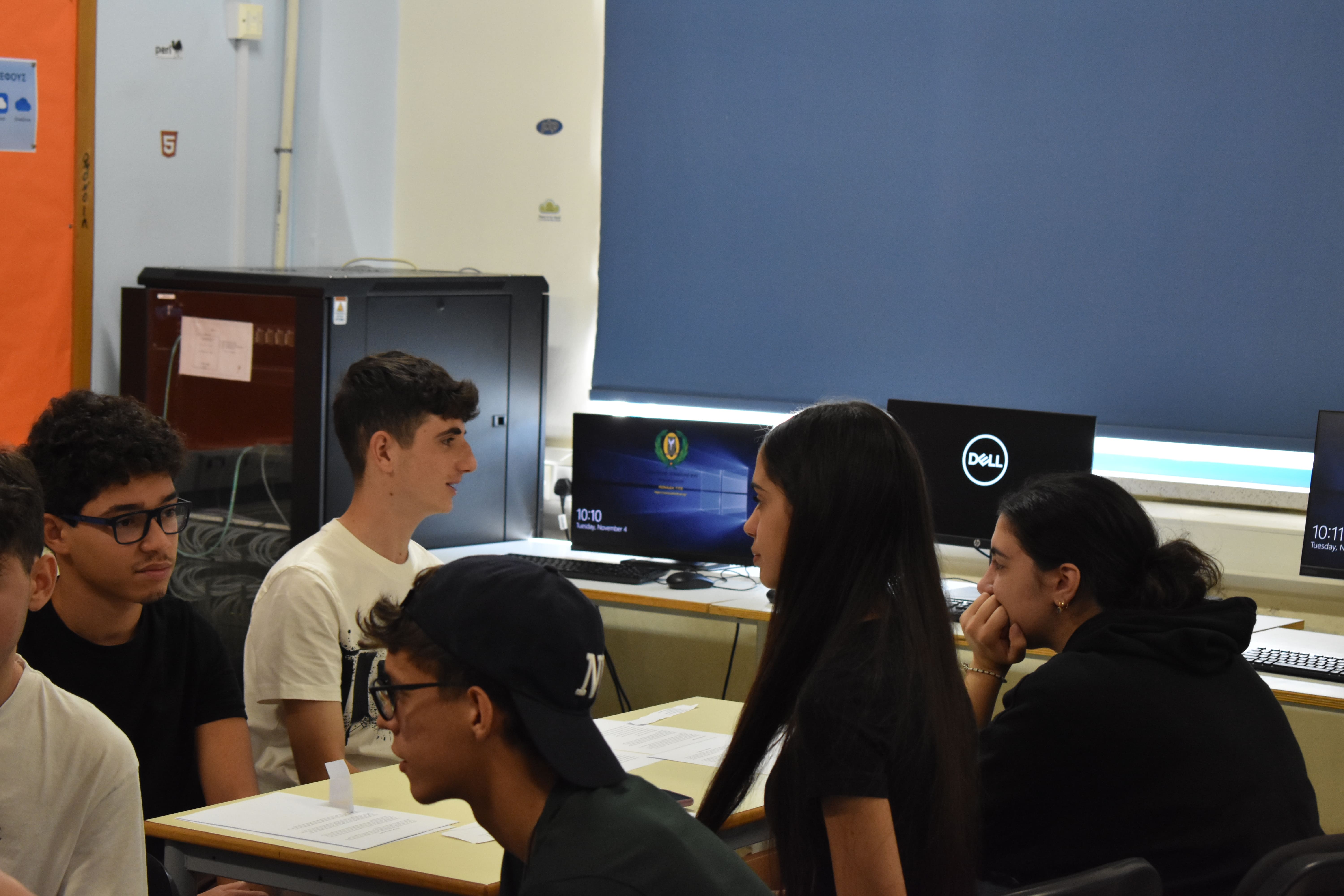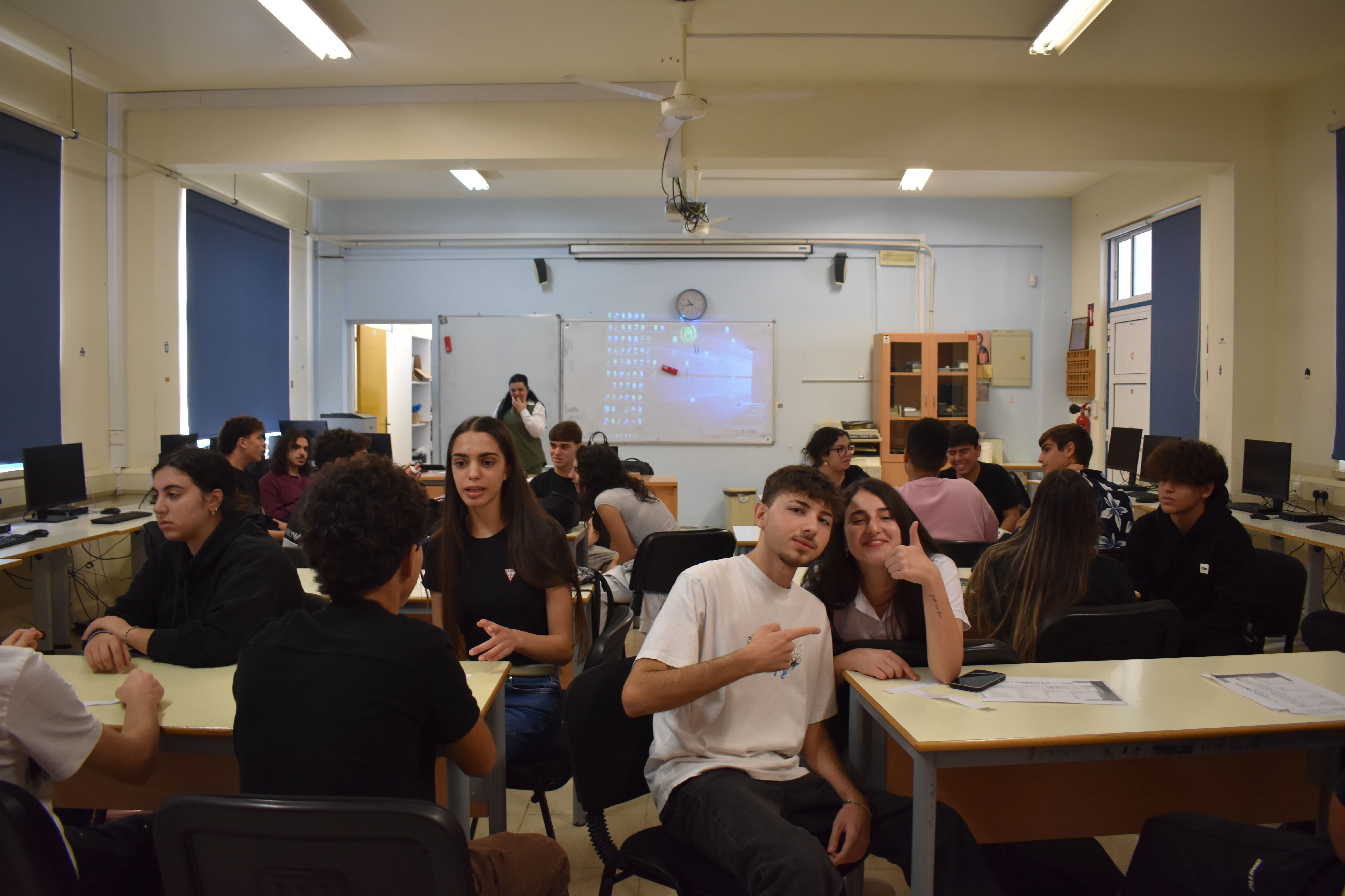 Στη συνέχεια, οι Ιταλοί μαθητές παρακολούθησαν μάθημα Αγγλικών μαζί με τους μαθητές μας, χρησιμοποιώντας την αγγλική γλώσσα ως κοινό μέσο επικοινωνίας σε ένα διαδραστικό και φιλικό περιβάλλον. Το μάθημα έγινε με την καθοδήγηση της καθηγήτριας Αγγλικών, κ. Μελίνας Χαραλάμπους. Το θέμα του μαθήματος ήταν η συμπερίληψη. Αρχικά, το μάθημα ξεκίνησε με καρτέλες γνωριμίας στοχευμένες στο θέμα. Έπειτα δόθηκαν στους μαθητές δύο κείμενα σχετικά κατανόησης με ερωτήσεις, τις οποίες κλήθηκαν τα παιδιά ν’ απαντήσουν και έγινε προβολή σχετικού βίντεο. Τέλος τα παιδιά προέβηκαν σε συμπεράσματα, για το πως θα ενσωματώσουν τη συμπερίληψη στην καθημερινότητά τους.