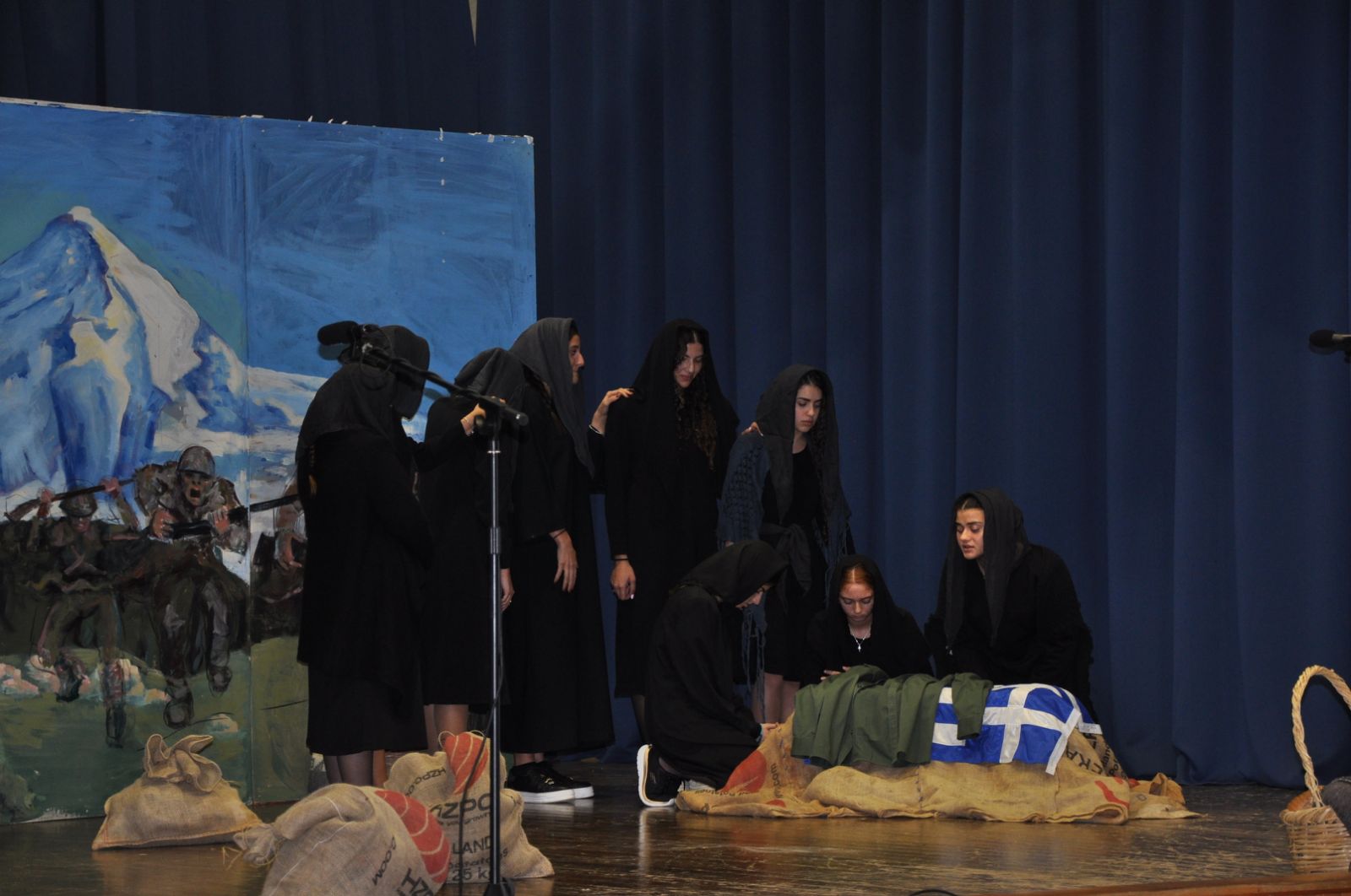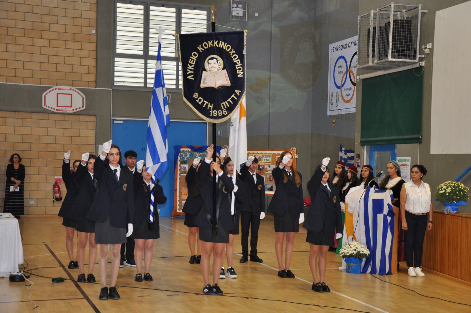 Σε κλίμα συγκίνησης και μεγαλοπρέπειας στο Λύκειο Κοκκινοχωρίων Φώτη Πίττα, τη Δευτέρα 27 Οκτωβρίου τιμήσαμε την Επέτειο του ΟΧΙ και τη γιορτή της Σημαίας. Με σεβασμό και εθνική περηφάνεια αποδώσαμε τιμές στο εθνικό μας σύμβολο, αυτό το ιερό πανί, το γαλανό και τ΄ άσπρο, που αντιπροσωπεύει την ιστορία και τους αγώνες του Ελληνισμού. Με δέος και ευγνωμοσύνη αποτίναμε φόρο τιμής στους ηρωικούς αγωνιστές της Πίνδου και στους κατοπινούς μάρτυρες της ελληνικής εθνικής αντίστασης στα χρόνια της τριπλής κατοχής, γιατί «την ώρα που ο φασισμός έσκιζε τον κόσμο, απ’ την Ελλάδα φάνηκε το φως».