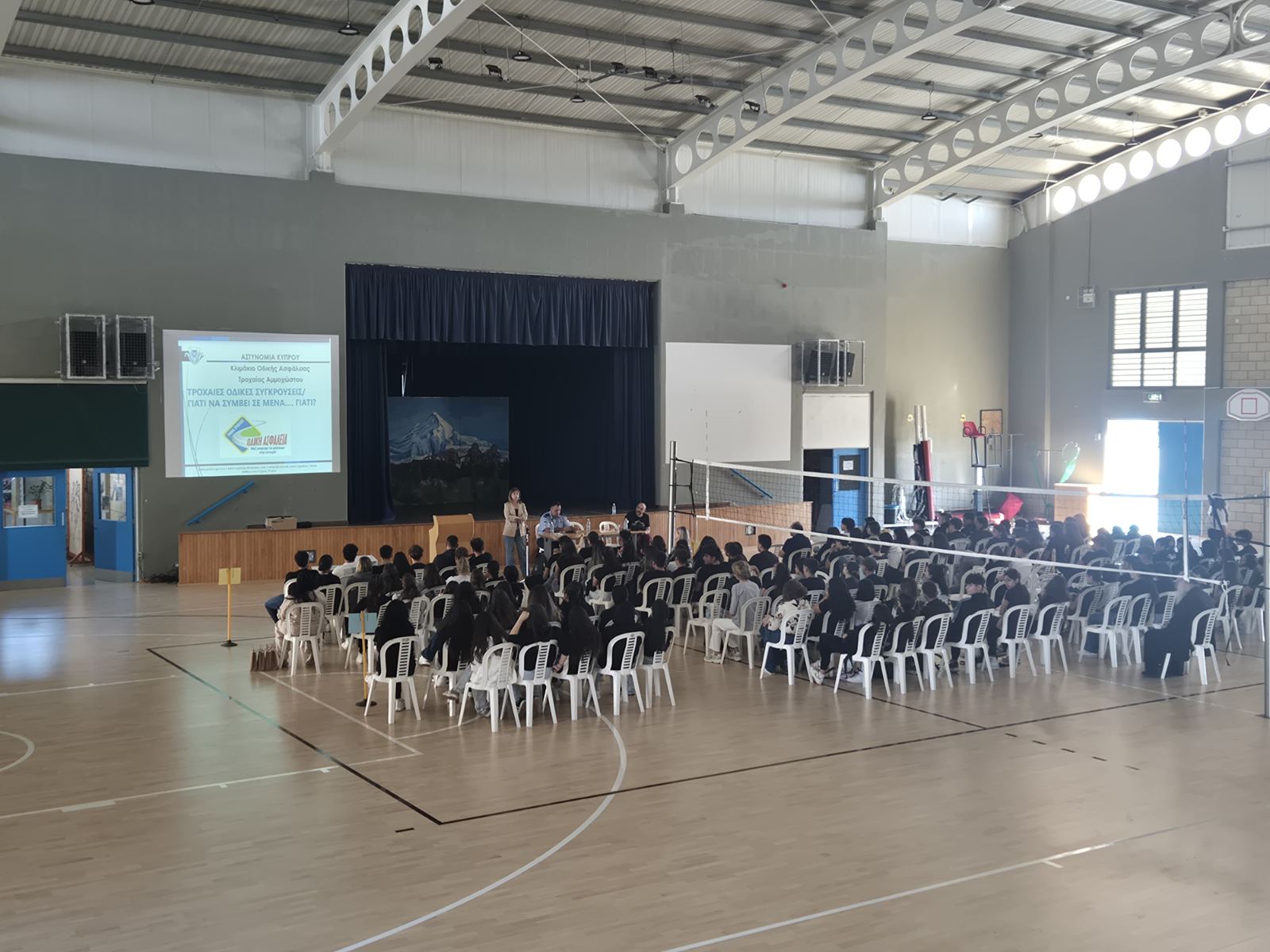 Διάλεξη για την Οδική Ασφάλεια πραγματοποιήθηκε στο σχολείο μας, την Τετάρτη 29 Οκτωβρίου, από την Πρόεδρο του Ιδρύματος Οδικής Ασφάλειας «Γιώργος Μαυρίκιος», κα. Λένα Κατελάρη, τον Πρεσβευτή Οδικής Ασφάλειας, κ. Αλέξη Δημητρίου, τον κ. Ρένο Ευαγγελάκη, καθώς και τον Υπεύθυνο Οδικής Ασφάλειας Αμμοχώστου κ. Γιώργο Δημητρίου.