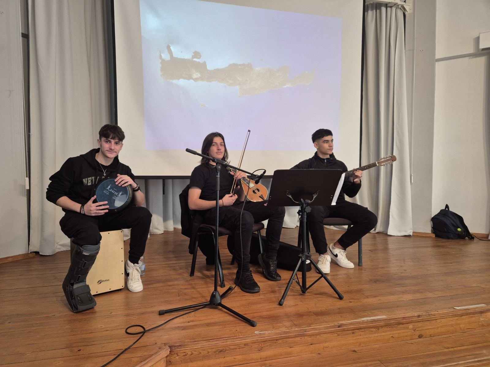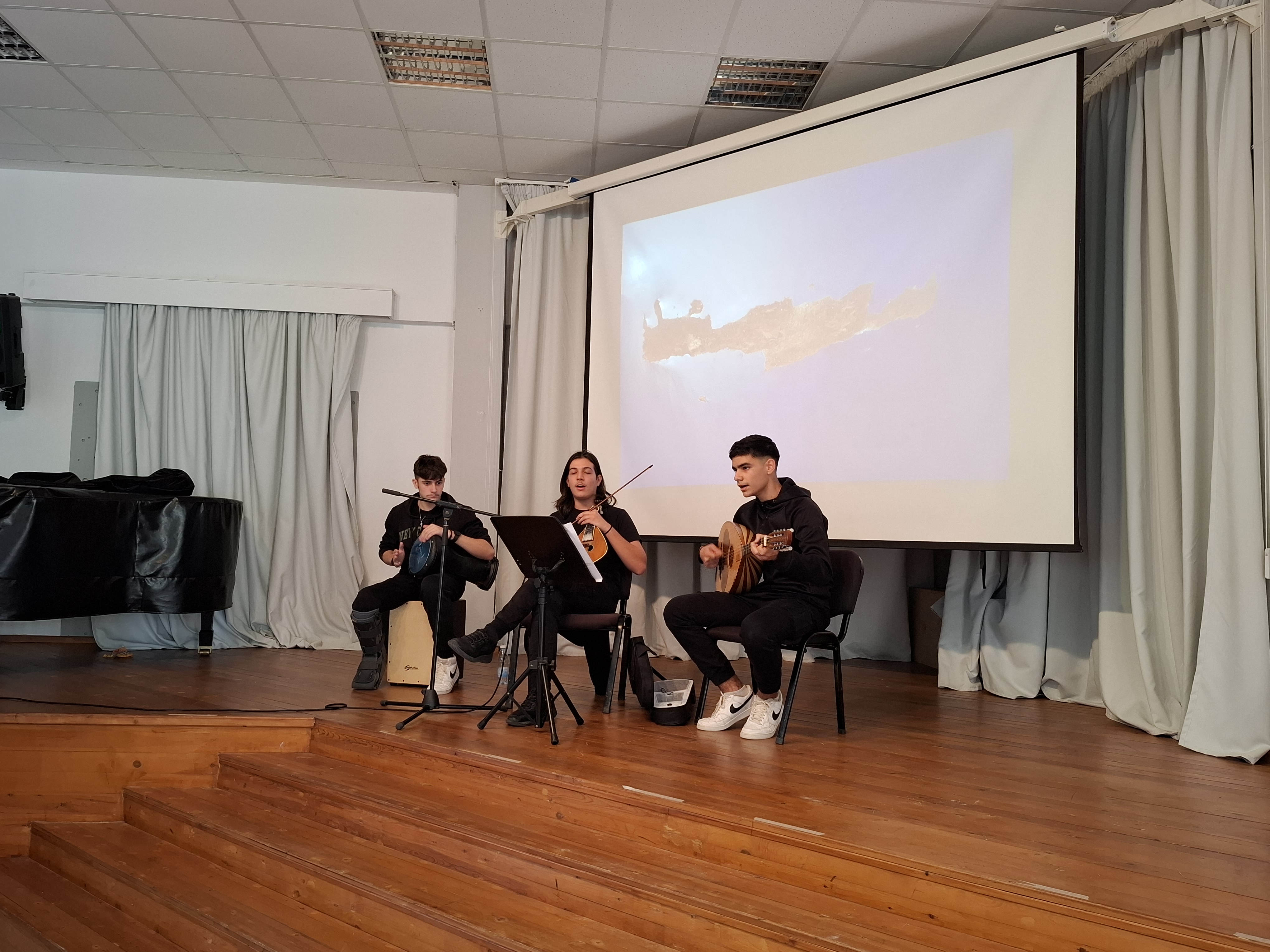 26 Νοεμβρίου 2025 - Κρητική Μουσική: Παναγιώτης Χριστοδούλου (Β6.1) (Κρητική λύρα), Πέτρος Κούλενδρος (Α2.1) (Λαούτο), Ελευθέριος Γαριβαλδινός (Β6.1) (Κρουστά)